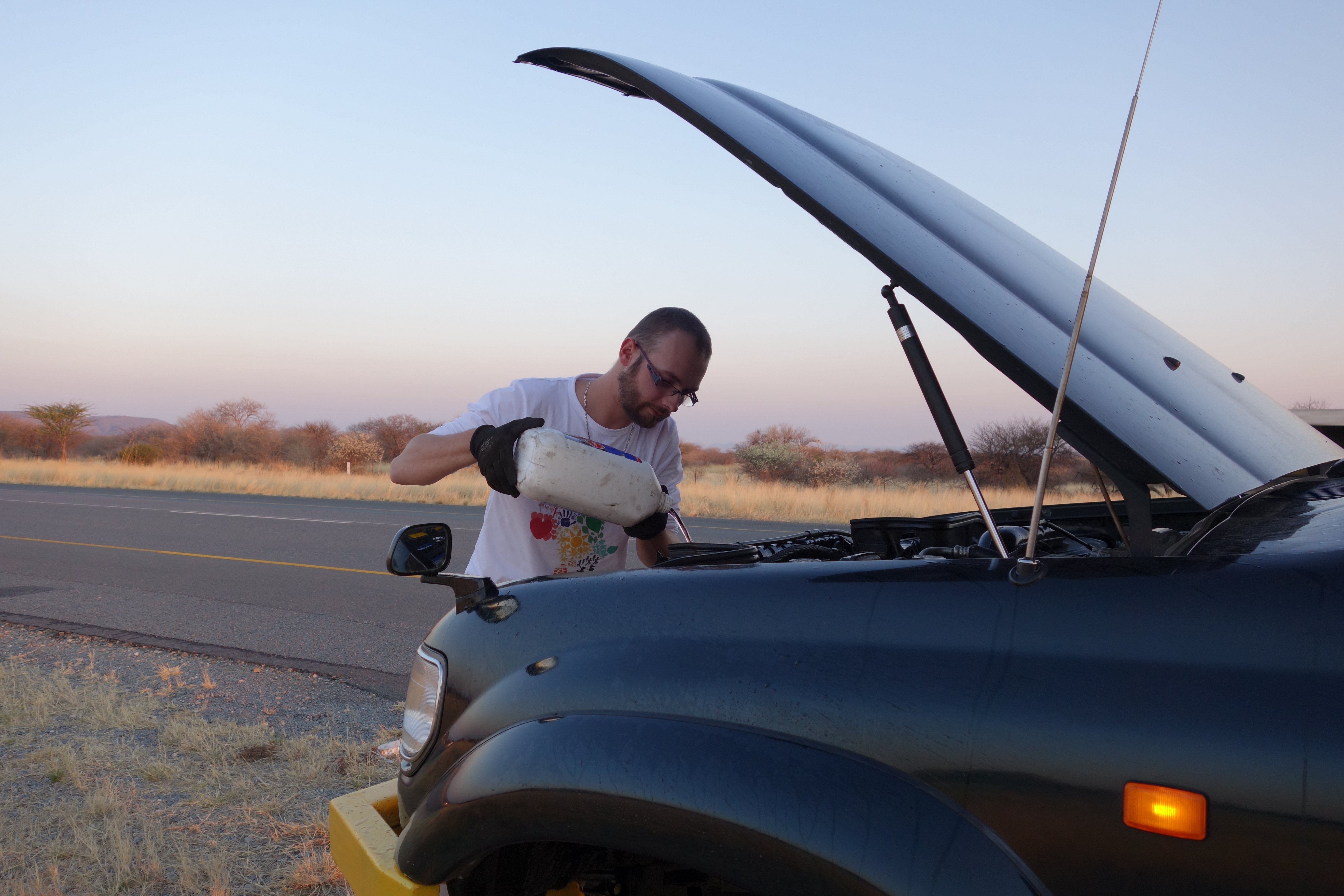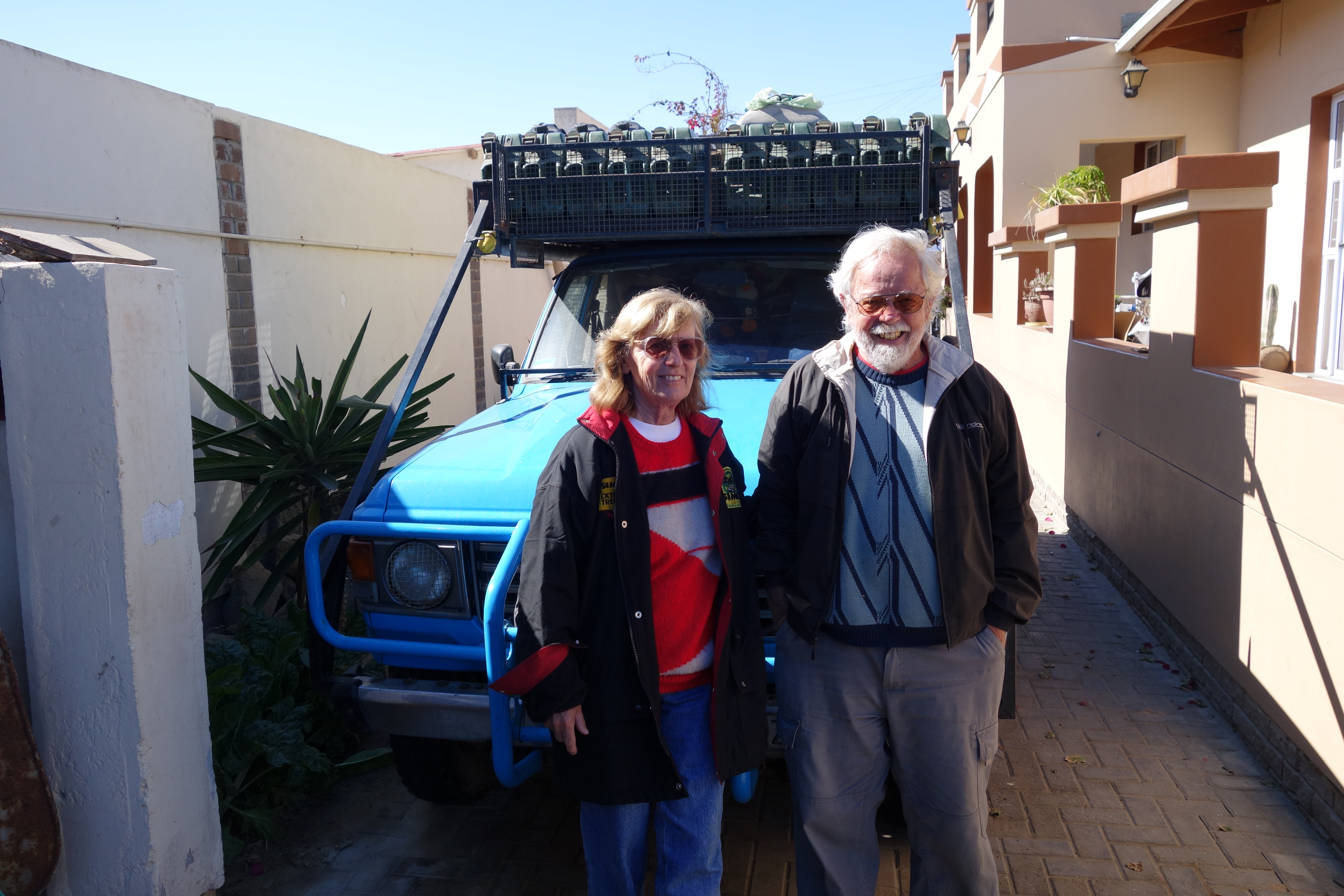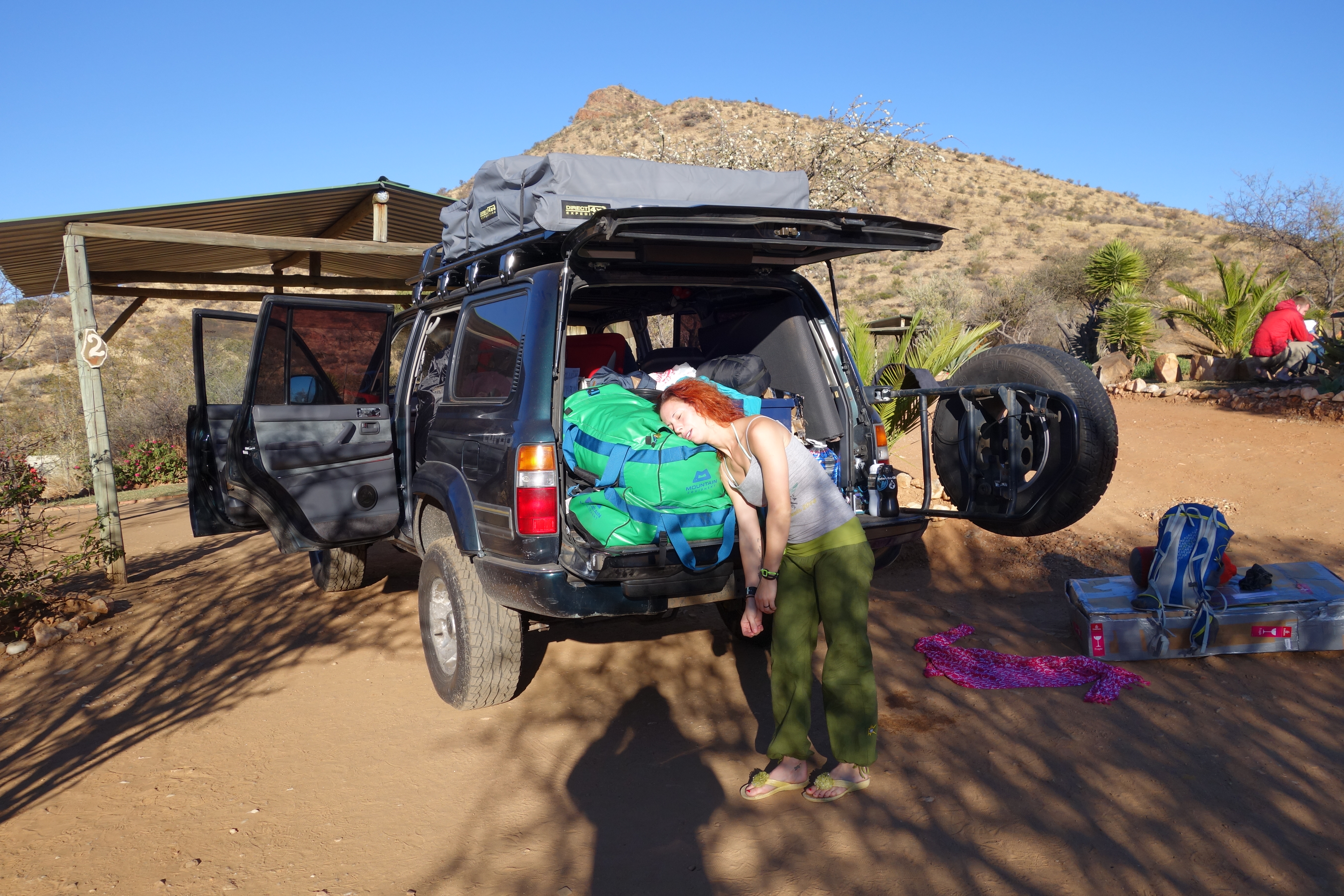 The support team has to head into Usakos for supplies, leaving Emma and Mike on their own. I am anxious the whole time. The roads are terrible compared to the UK but not bad once you get used to the juddering. I also learn to drive faster as that way we seem to glide over the top. I’m not sure if that is what happens in reality. We don’t get back until the early afternoon, leaving Mike to rig up some shade from the midday sun for Emma.