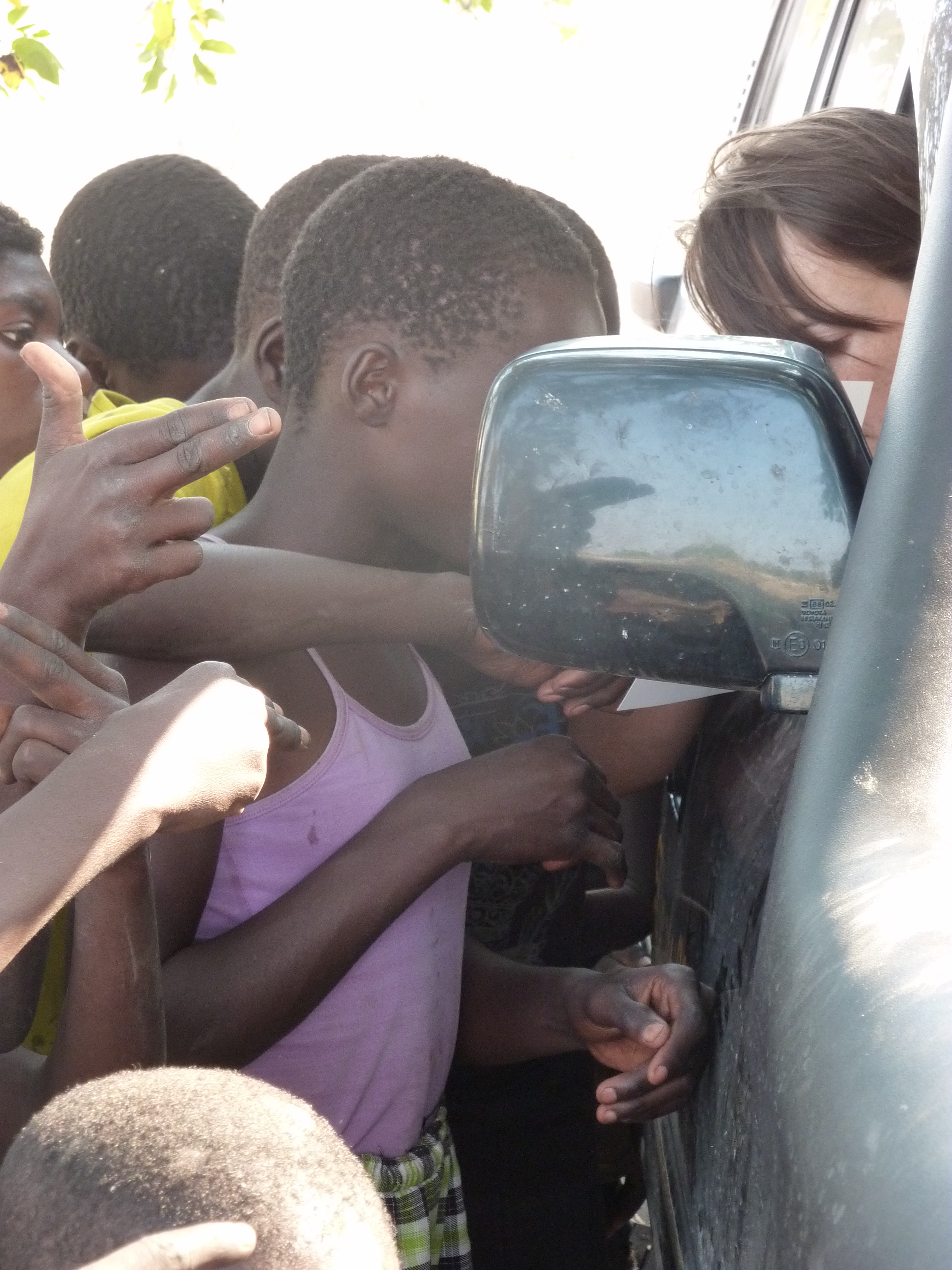The school children are there to laugh and interact. Group no 3 are fascinated by everything and want something, anything. They don’t understand that we do need our kit and cannot easily get more. It’s a pleasure / pain experience: it’s great to connect and interact but after a while the pressure to entertain means it would be nice to have a break. Chatting to them is interesting, though, even with the language barrier. When I point out Namibia and Angola on our maps, with soft reverence they chorus, “Angola”. Many of the children are refugees displaced by the war. Clearly, their hearts long to go back.
