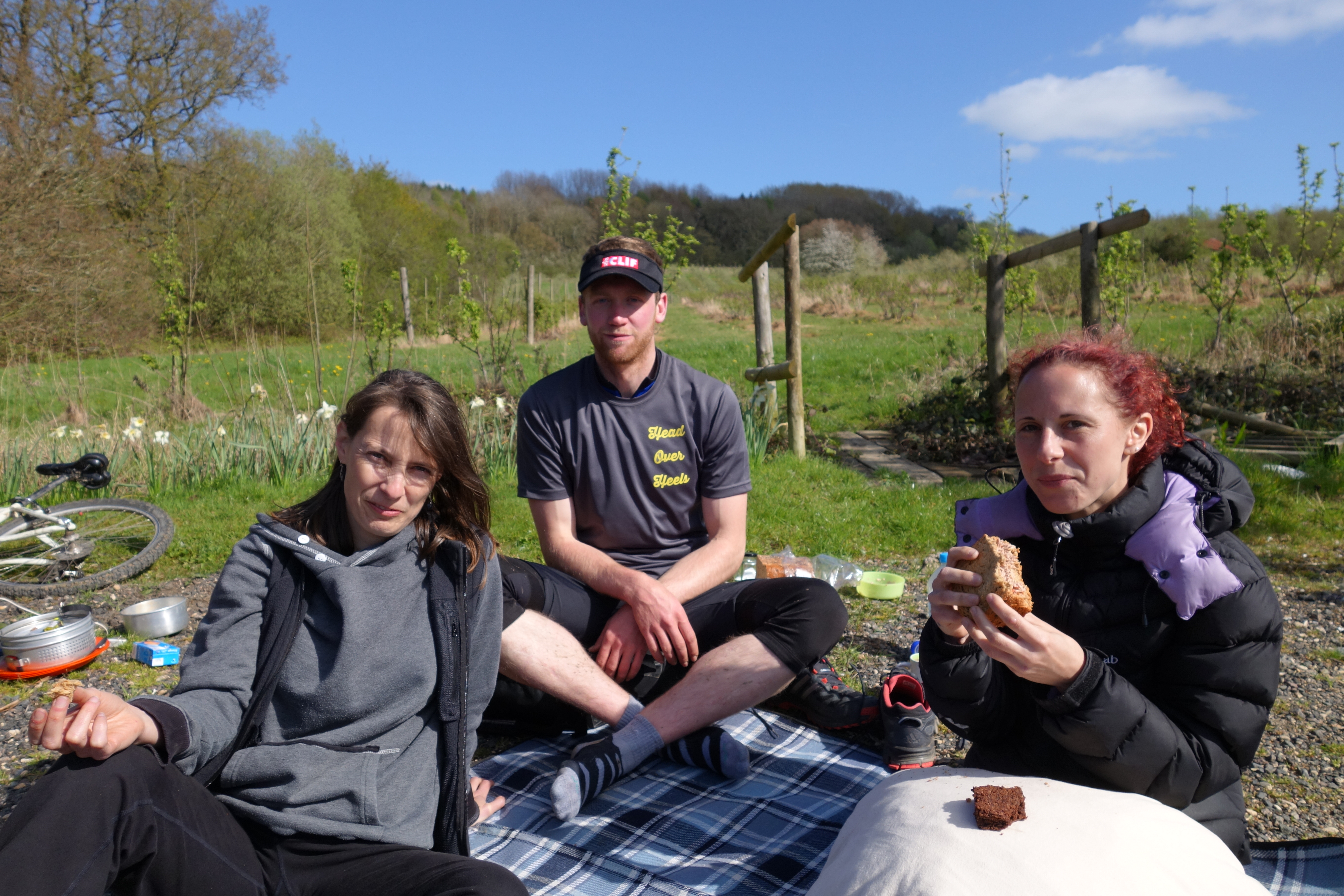 Happily, this time, I am early for lunch. Its a gorgeous sunny day and the birds are nattering away. A few minutes later, Emma and Mike appear trundling down across the field and Hayley (our guest for the day) pulls up in a car. It’s idyllic. I feel there should be more drama on a 100 mile run, not chilling in the sun. Lunch is delicious. Chicken, avocado, basil, tomato, salt and pepper – I made it myself. Mike falls asleep and Hayley and Emma are busy catching up and laughing.