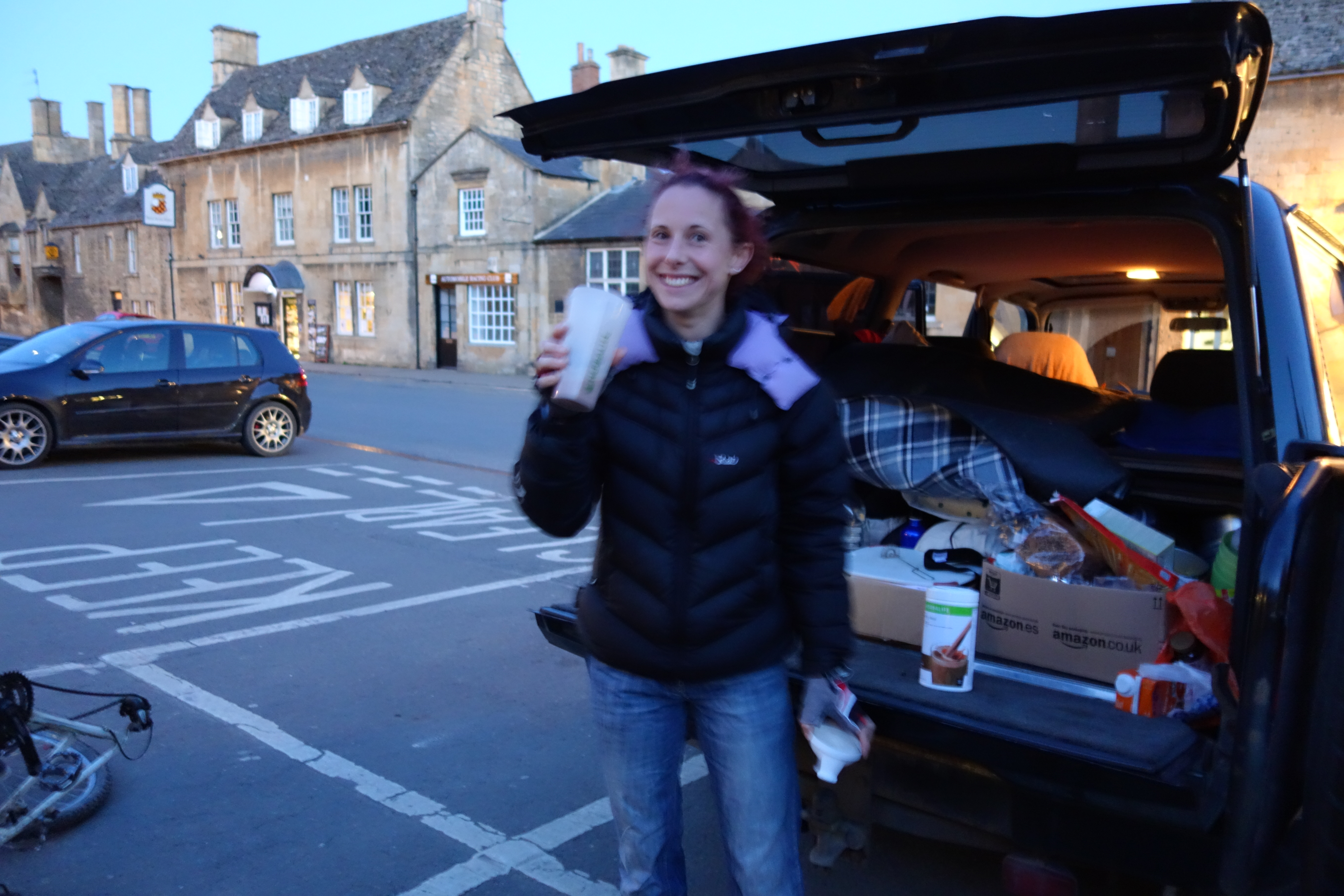 Once we’re all off, I am swiftly lost and take up talking to myself. We get on remarkably well but an extra set of eyes to look at the map and road signs would be more useful than a split personality. “Uley” I shout with joy for no-one to hear (it’s a village that means I’m going in the right direction). And am 5 minutes late for mid-morning break. Emma and Mike are both quiet. They went in the wrong direction and its dampened both their spirits a bit. Emma’s cold again and I worry whether she’s getting enough food in her. I shouldn’t really though, when I next see them, they are both chipper. Its an odd relationship, me dipping in and out of their experience. After lunch, Emma wants to push on as far as she can and gives me 5 options where she might want to be picked up from. I get busy with finding accommodation nearby. Happily, I find some out the back of a friendly pub. Emma and Mike call me to come and collect them. I’m there first (woohoo!) and surprised when they both come bounding up to me – turns out they’re both rushing on CLIF gels.